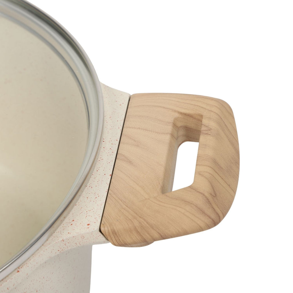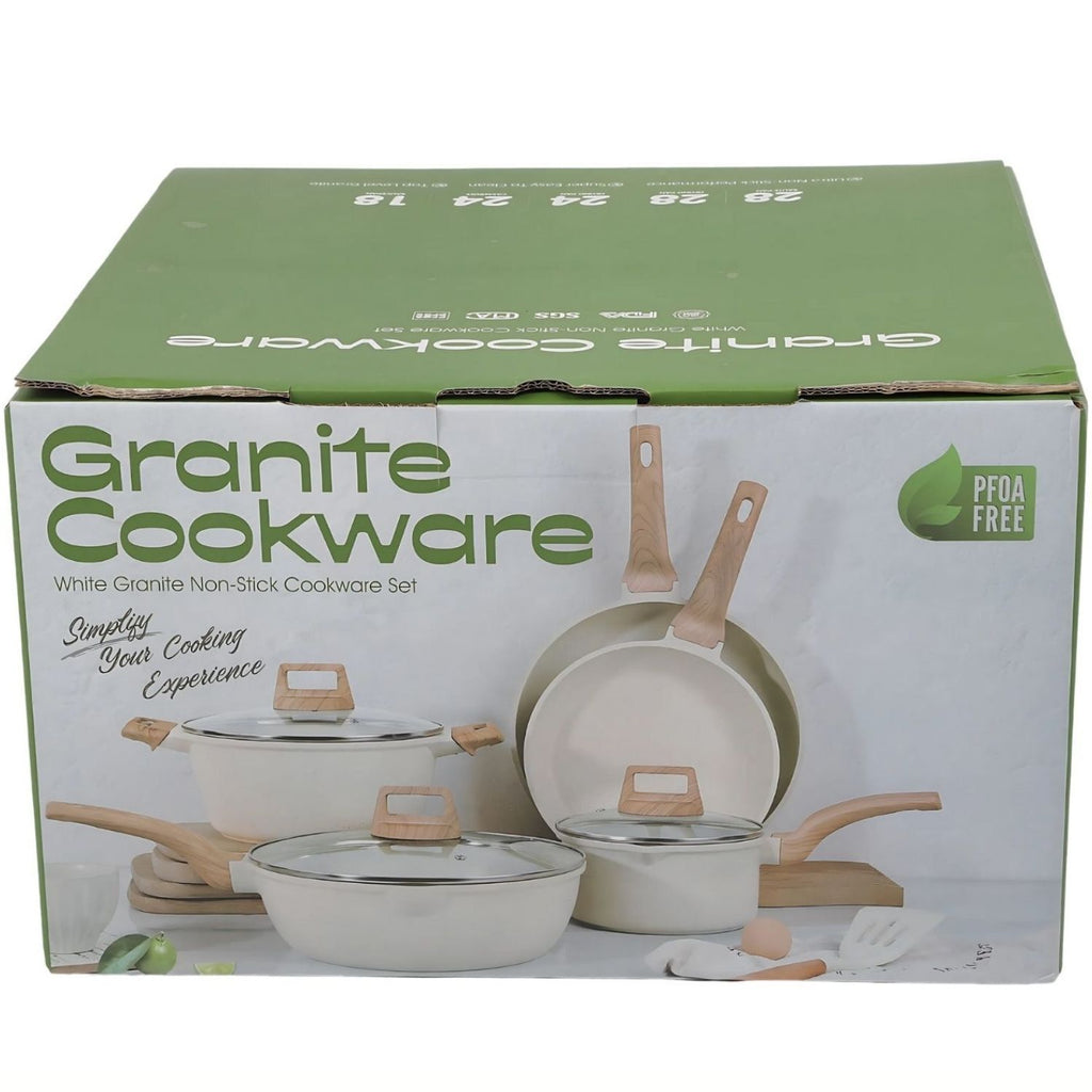 Juego de cocina antiadherente de 9 piezas con acabado tipo granito blanco.