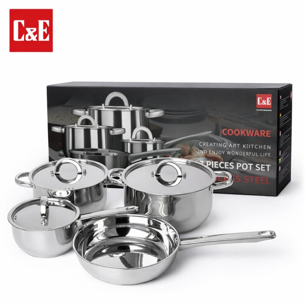Ollas de Acero Inoxidable. Acabado Brillante Set de 7 Piezas. Color Plateado