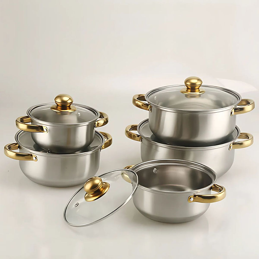 - Juego completo de cocina con 5 ollas de diferentes tamaños: 18 cm, 20 cm, 22 cm, 24 cm y 26 cm, todas con tapa de vidrio templado resistente al calor.