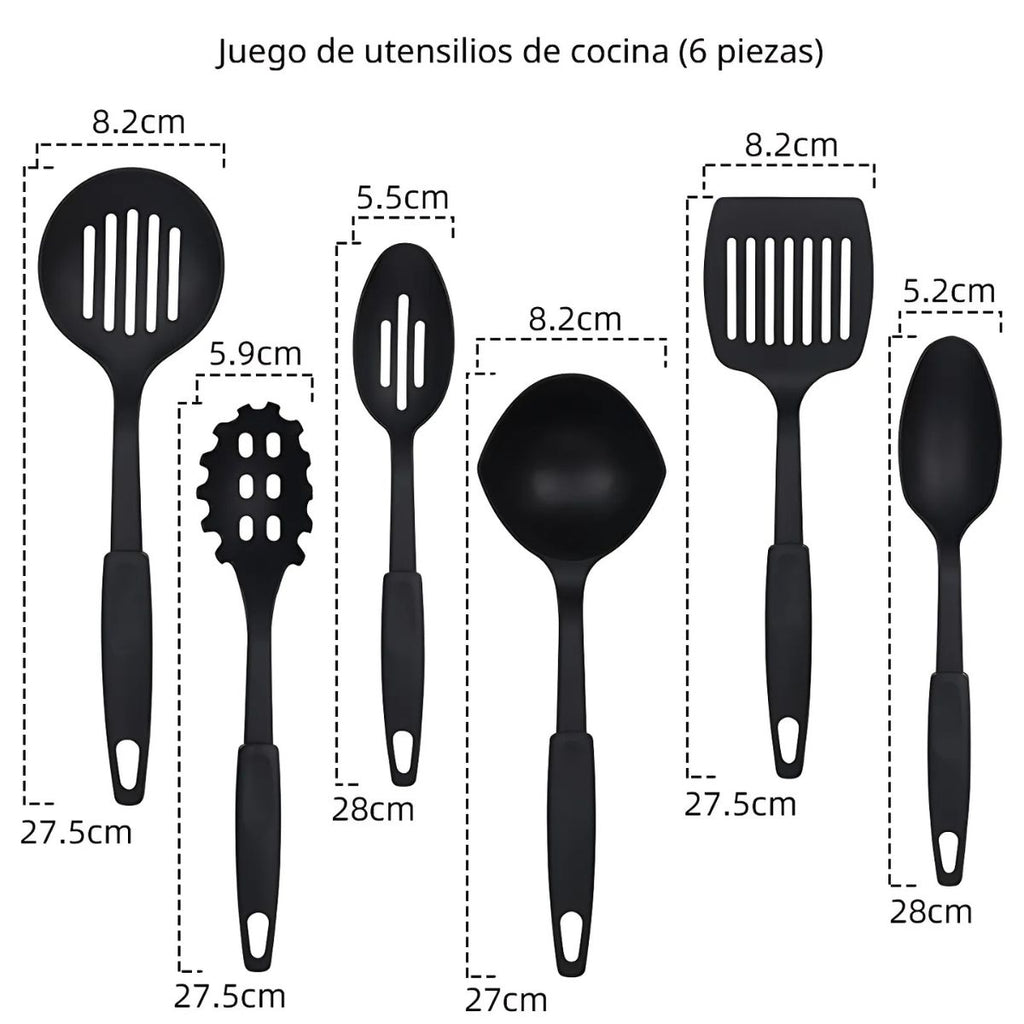 - Incluye 6 utensilios de cocina de nylon resistentes al calor, perfectos para proteger tus ollas de rayaduras.