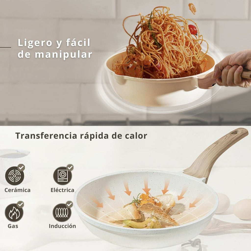 - Mangos ergonómicos de imitación madera, cómodos y resistentes al calor.