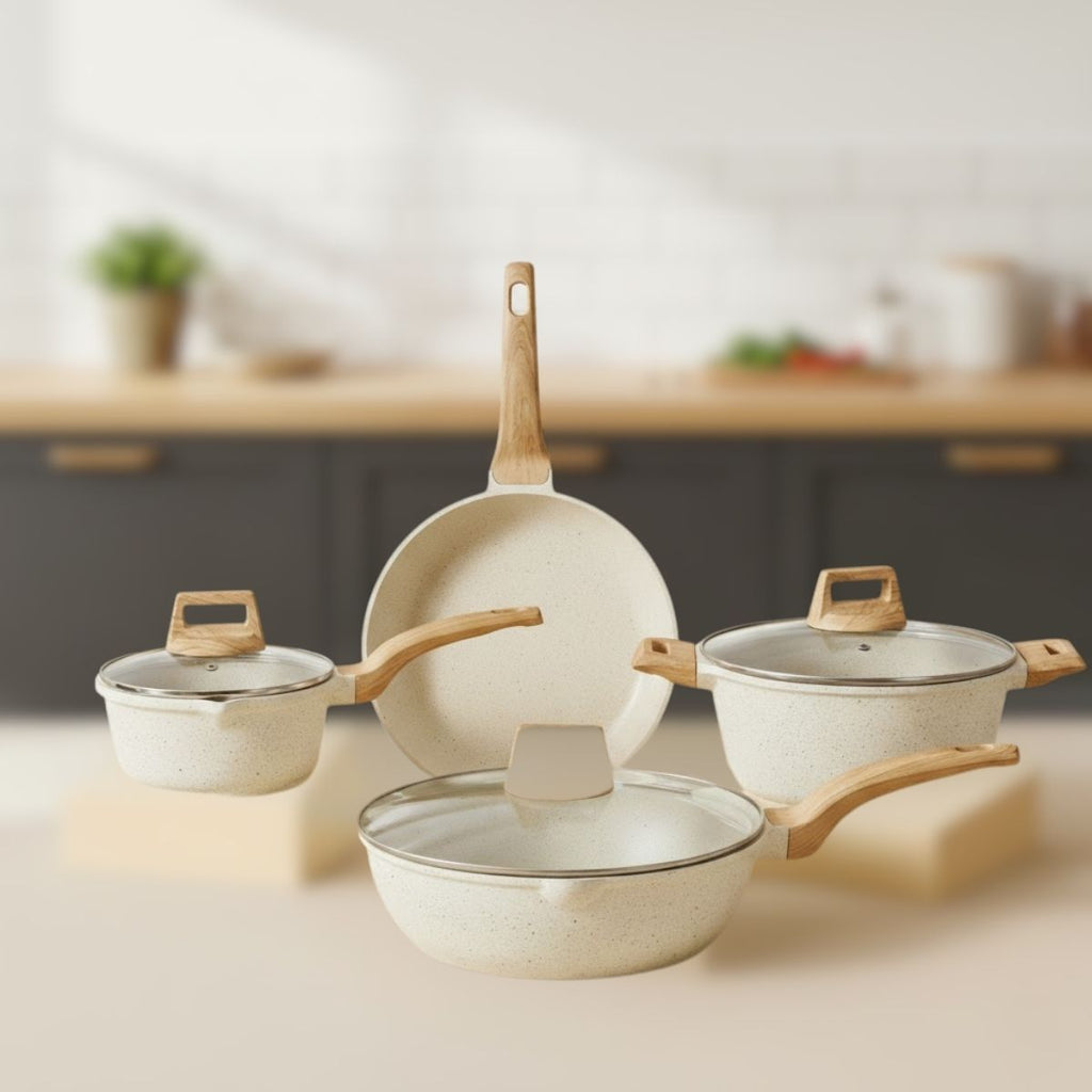 - Juego completo de ollas, sartenes y cacerolas con revestimiento de piedra de maifan de alta resistencia.