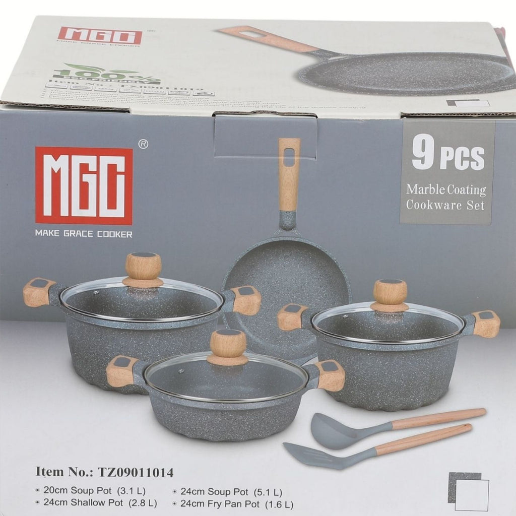 Ollas y Sartén Antiadherente Color Rosa, con detalles en madera. Set de 9 piezas. Eco-Friendly. Set de 9 piezas.