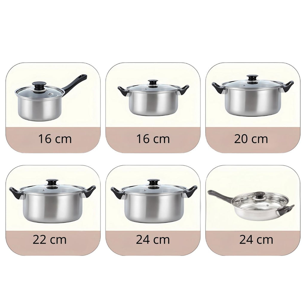 - Juego completo de 12 piezas: incluye ollas de 16cm, 20cm, 22cm, 24cm con tapa de vidrio templado, un sartén de 24cm y una cacerola para hervir agua.