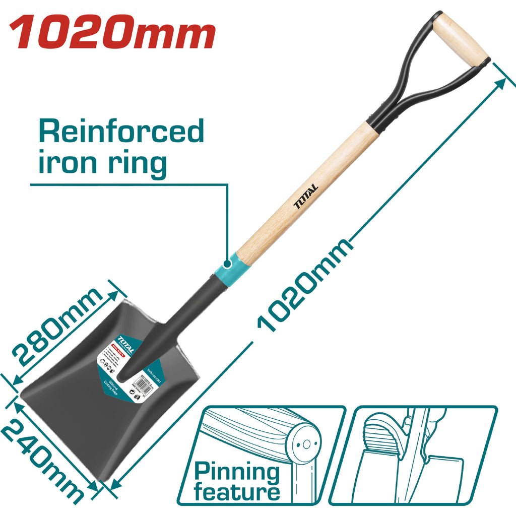 Pala cuadrada de 1030 mm de largo. Pala 240 x 280 mm mango de madera. Material: Acero al Carbón.