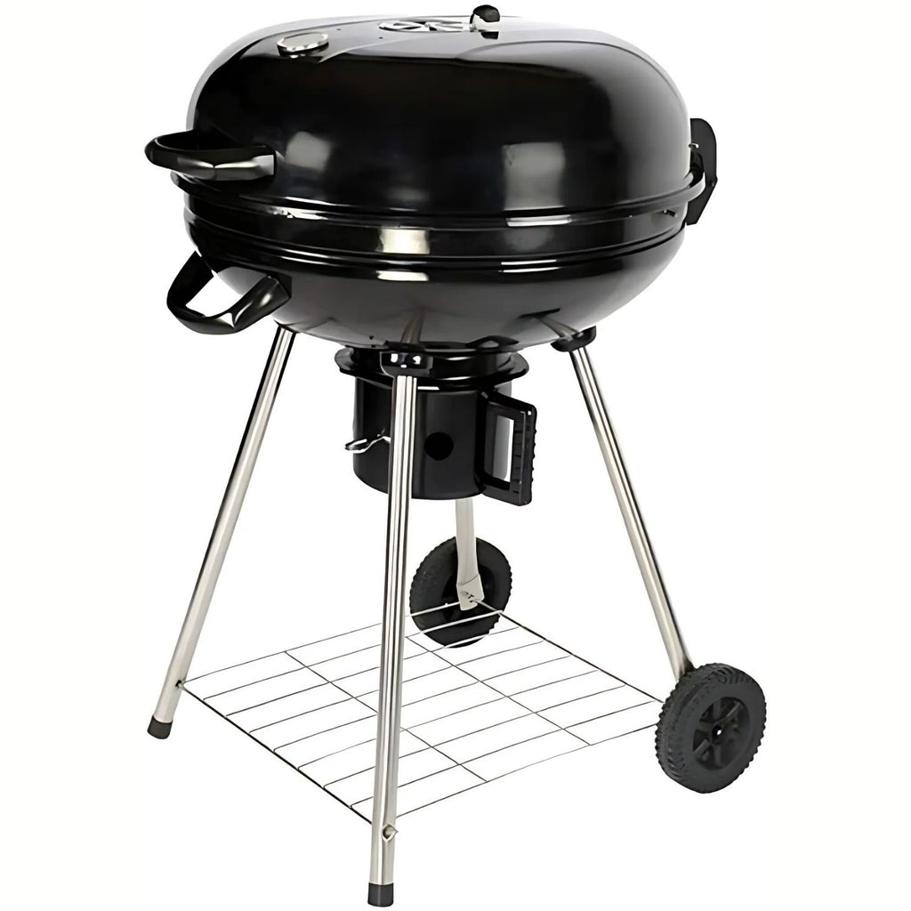 -Parrilla de carbón redonda con tapa metálica y termómetro integrado para controlar la cocción.