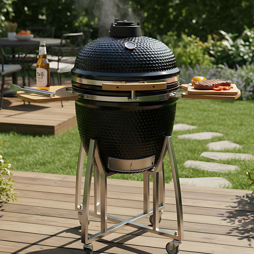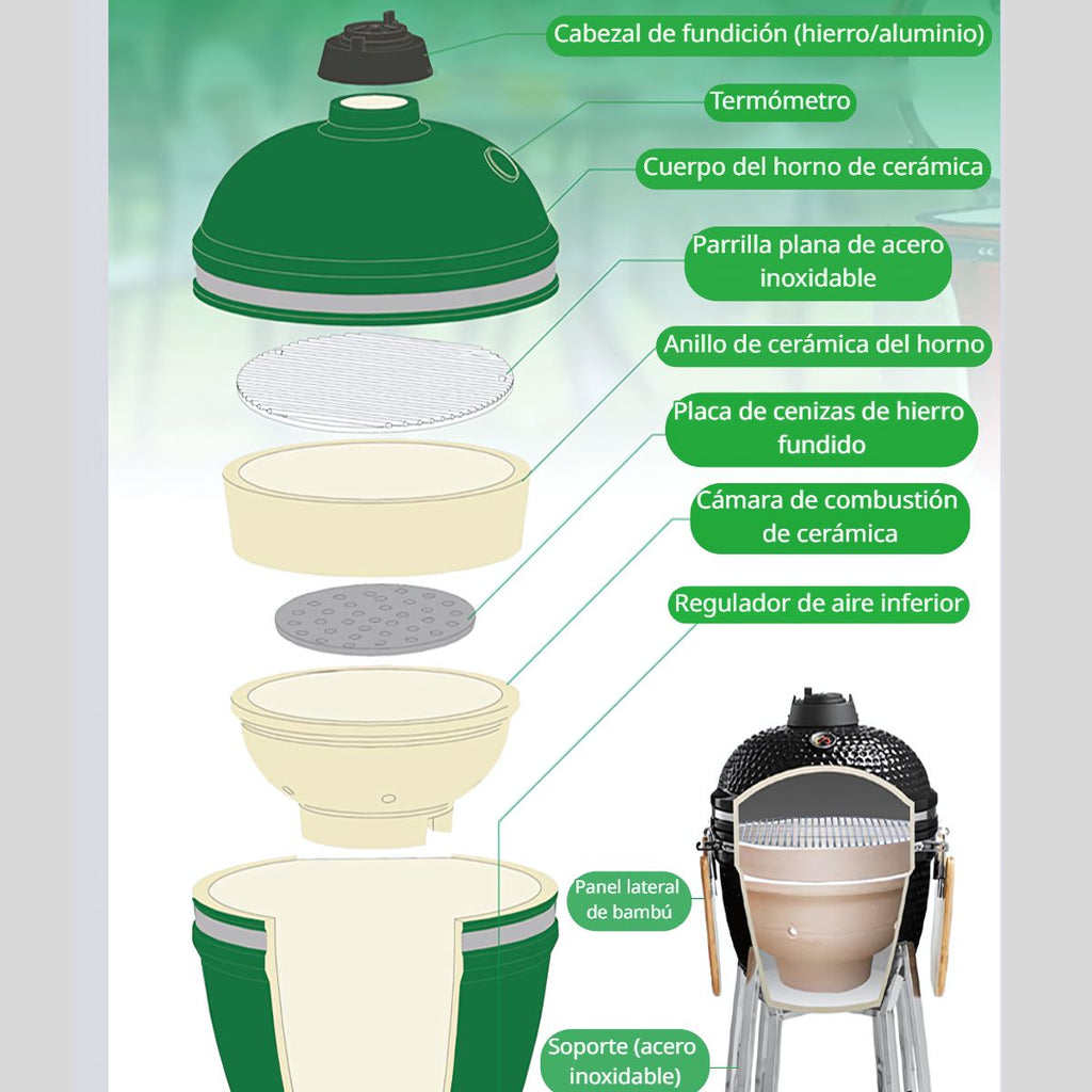 - Horno y parrilla cerámica tipo Kamado, ideal para asar, hornear, ahumar y cocinar a la perfección.