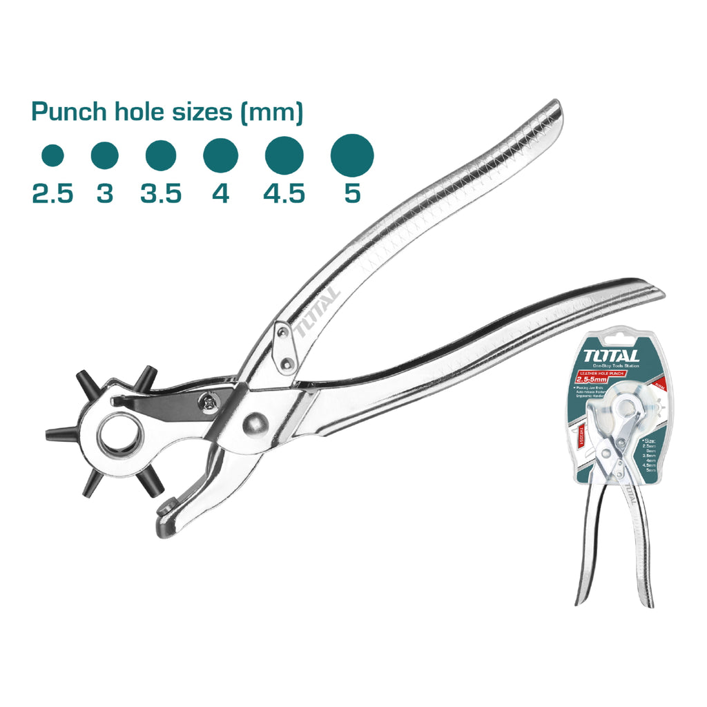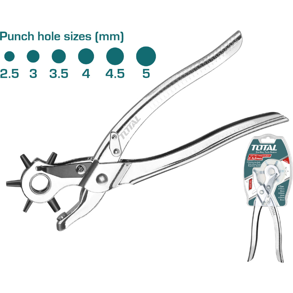 Perforadora de Cuero con mango ergonómico y función de liberación automática. Tamaños de orificios de perforación: 2.5 mm, 3 mm, 3.5 mm, 4 mm, 4.5 mm, 5 mm.