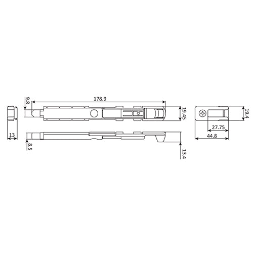 Picaporte de PVC para segunda hoja de puerta o ventana abatible. Funciona en Canal de sistema Europeo. Largo de 179 mm. Color negro.