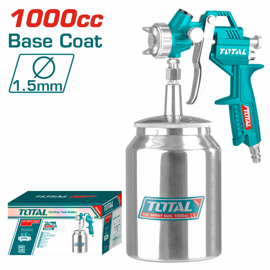 Pistola de aire para pintar. Boquilla 1.5 mm. Ancho de spray regulable entre 140-180 mm. Capacidad 1000cc. Usado para capa base. Presion opertiva 3-4 bar. Consumo 4.2-7.1cfm
