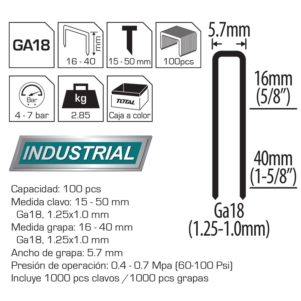 •Medida grapa: 16 - 40 mm Ga18, 1.25x1.0 mm