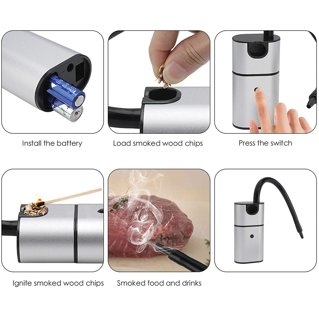 •Fácil de usar. Funciona con 2 pilas AA (no incluidas). Insertar el tubo para ahumar, colocar los chips de madera en la malla, luego encender las virutas de madera y pulsar el botón de encendido. Después de terminar, esperar que la pistola ahumadora se enfríe, luego proceder a limpiarla (NO se recomienda en el fregadero).