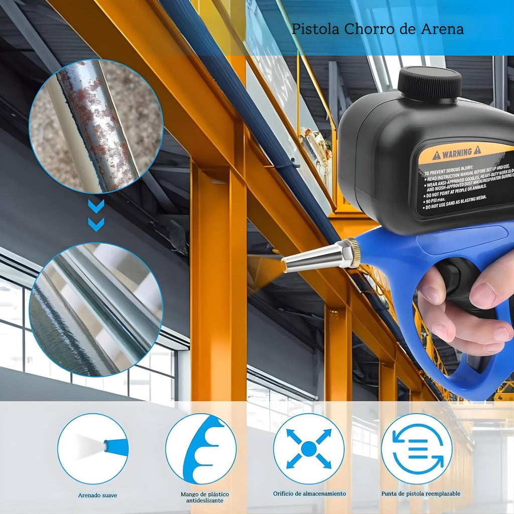 - Pistola de arenado por aire ideal para limpieza de óxido, pintura, corrosión y suciedad en superficies metálicas.