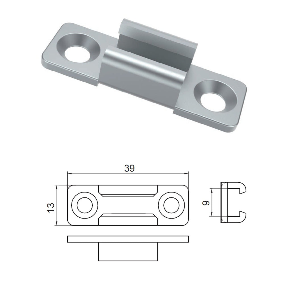 Con dimensiones de 39 mm de largo × 13 mm de ancho × 9 mm de alto, este accesorio está diseñado para trabajar en conjunto con herrajes multipunto estándar, ofreciendo un anclaje estable y de fácil instalación en carpinterías de PVC.