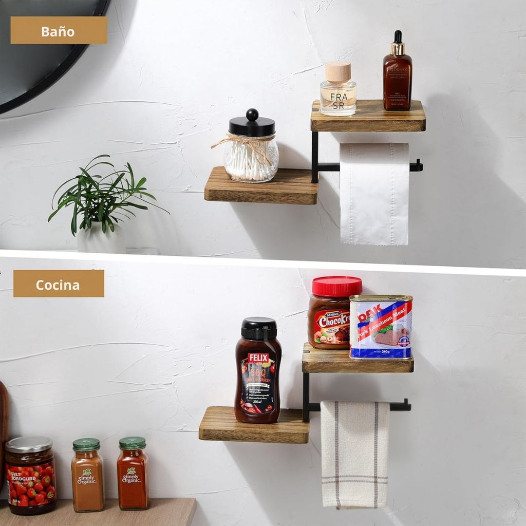 Portarrollos De Papel Higiénico De Madera Maciza Con Hierro. Soporte De Papel Sanitario Con Repisa. Porta papel.