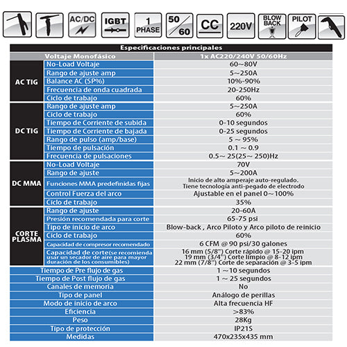 POWERMASTER256 Maquina Tig HF AC/DC. Corte con plasma 22 mm y electrodo (220V 60 Htz) Heavy duty uso industrial.(1año)