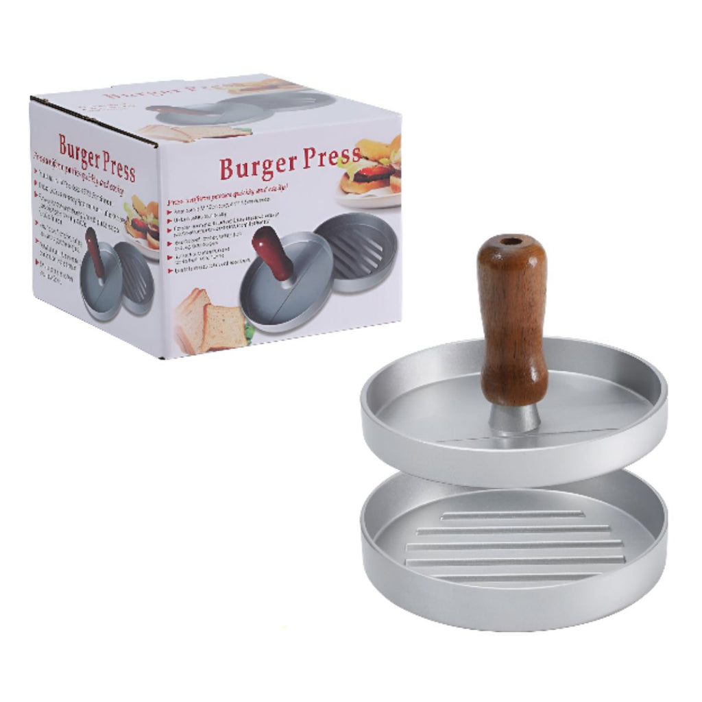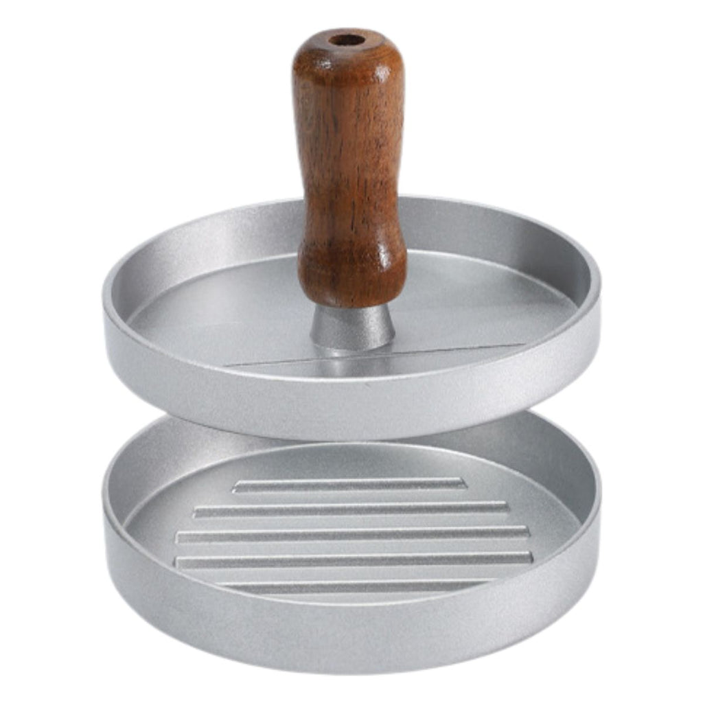 - Prensa para hamburguesas fabricada en aluminio resistente, ideal para formar patties uniformes.