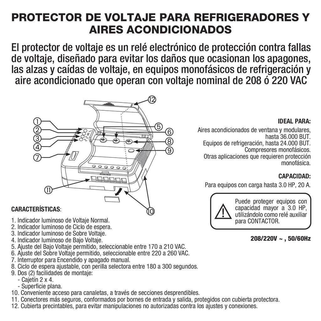 Protector de Voltaje 220Volt - 50/60Hz. Corriente 20A para aires acondicionados y refrigeradores con retardo ajustable