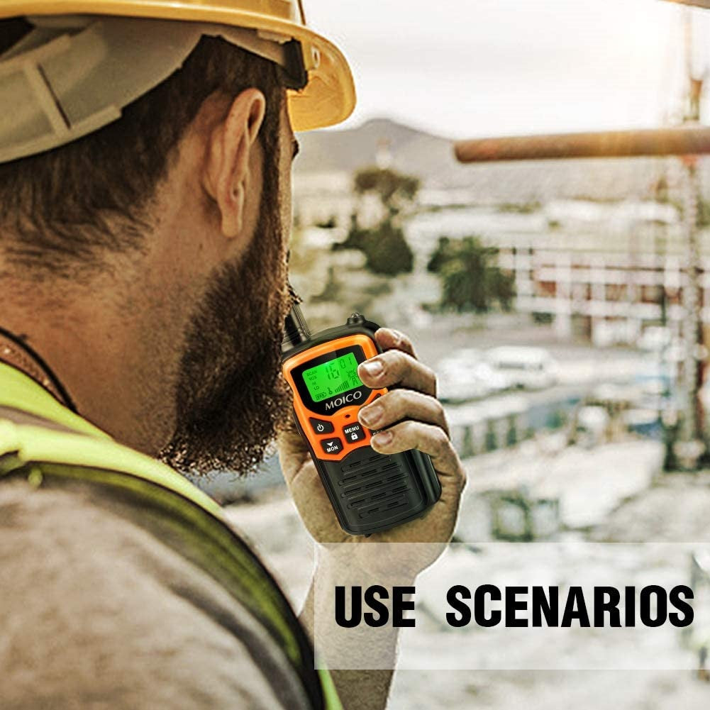 Los walkie talkies de Moico soportan un rango de comunicación de 1.5 millas/2.41Km en campos abiertos. El clima adverso, el coche (material de hierro), los viajes y los edificios (patio, calle) afectarán al alcance.