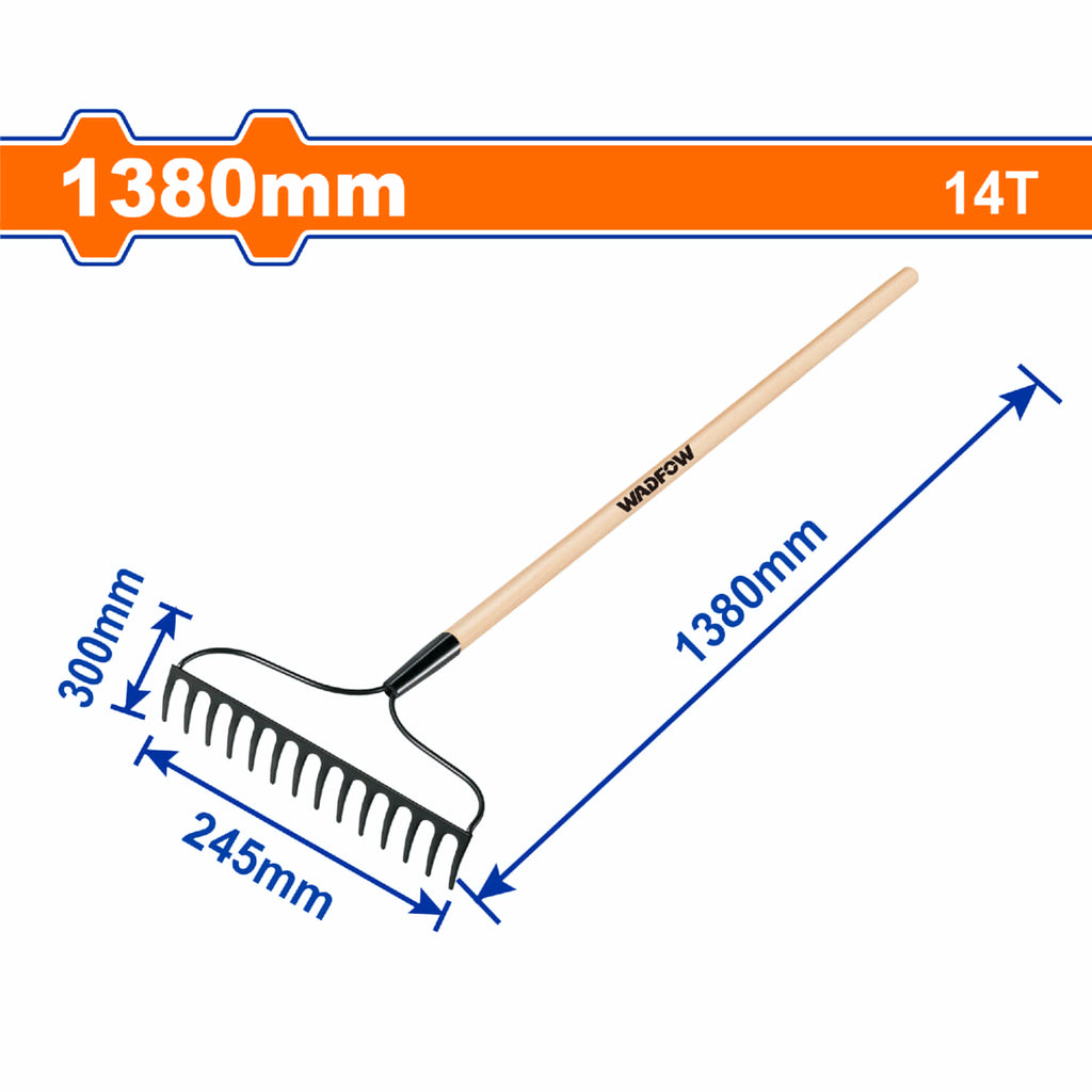 | Características | Rastrillo metálico con mango de madera de 14 dientes. |