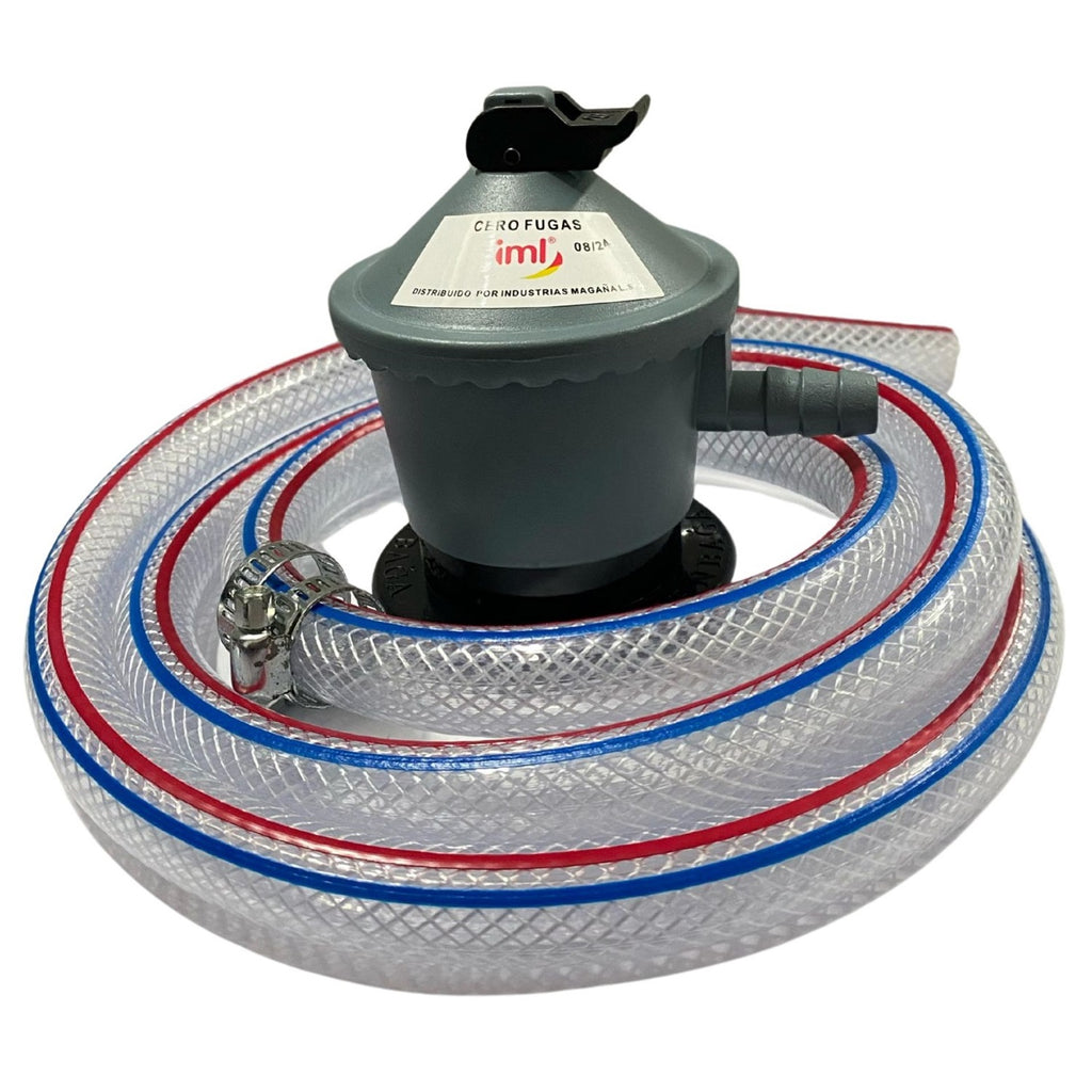 Regula la presión de gas del tanque a la estufa. Puede manejar hasta 2 kilogramos de gas por hora.