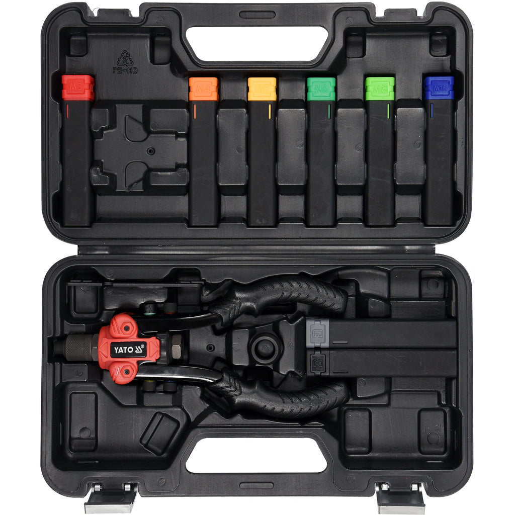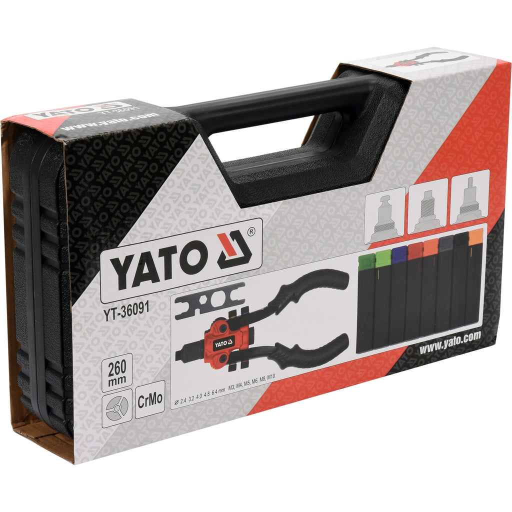 DE REMACHADOR DE MANO: 2.4, 3.2, 4.0, 4.8, 6.4, TAMAÑOS DE REMACHADOR DE TUERCA DE MANO: M3, M4, M5, M6, M8, M10, ESCARIADOR: BORDE CURVO 1PC, BORDE CUADRADO 1PC, MULTI-LLAVE 1PC, MATERIAL DEL CUERPO: ACERO AL CARBONO + PVC, SUPERFICIE: FOSFATADO, PINTURA EN POLVO, MATERIAL DE LAS MANDÍBULAS: CRMO, LONGITUD: 260MM; COLOR: NEGRO – ROJO (PANTONE 485C) CON LOGOTIPO PULIDO CON LÁSER (EL MISMO QUE TENEMOS EN YT-36140); COLOR DE BMC – NEGRO, CON LOGOTIPO Y NÚMERO DE ARTÍCULO EN RELIEVE