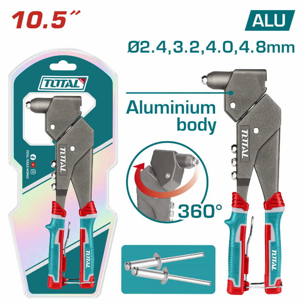 Total Tools te ofrece la remachadora giratoria 360 grados, permite su uso en diversas posiciones, por lo que tiene acceso a los más diversos lugares, facilitando el trabajo.