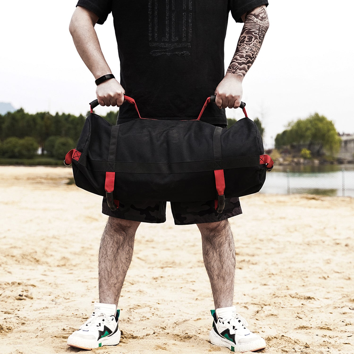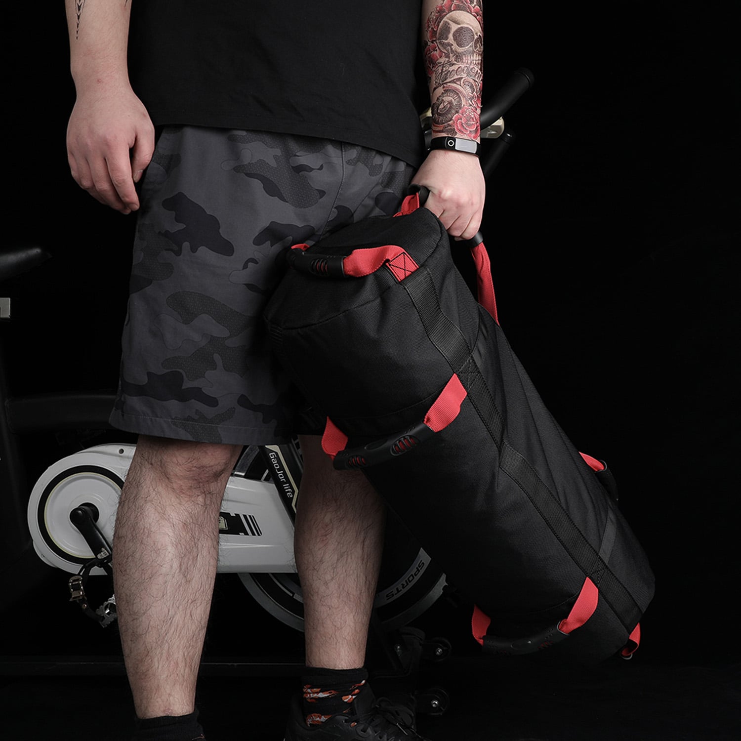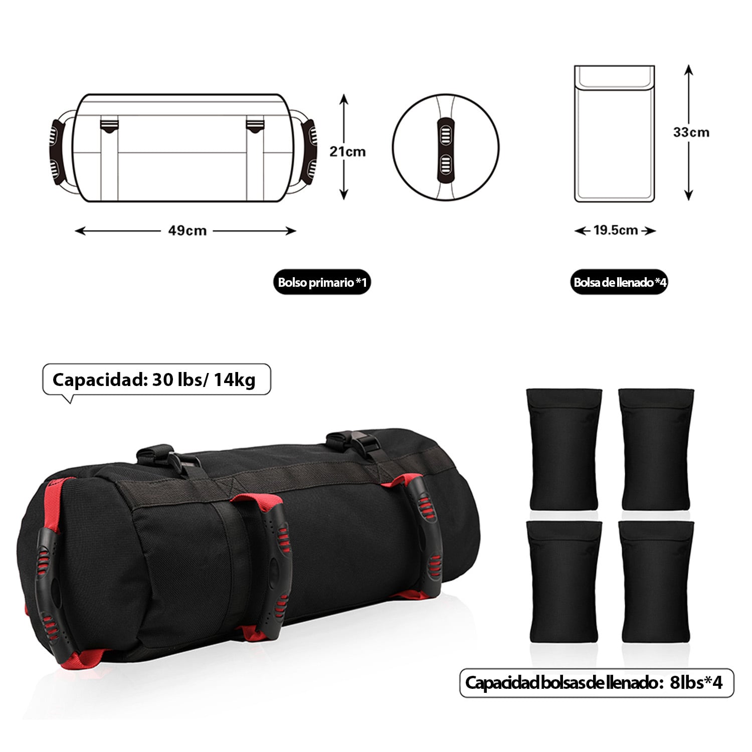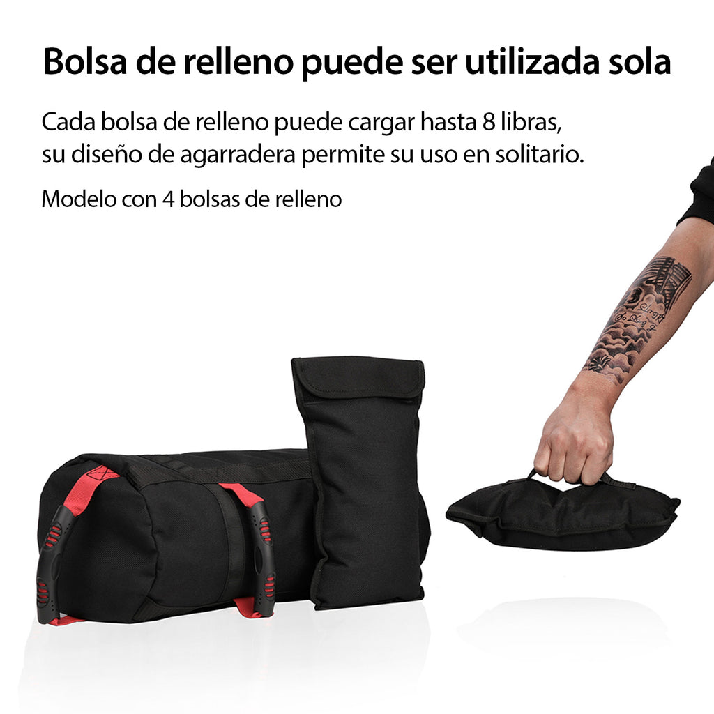Este maletín heavy duty construido con materiales de primera es esencial para el entrenamiento físico funcional, te permite rellenar las cuatro bolsas de arena con 3.5kg de arena de playa cada una, para un total de 28kg de peso.