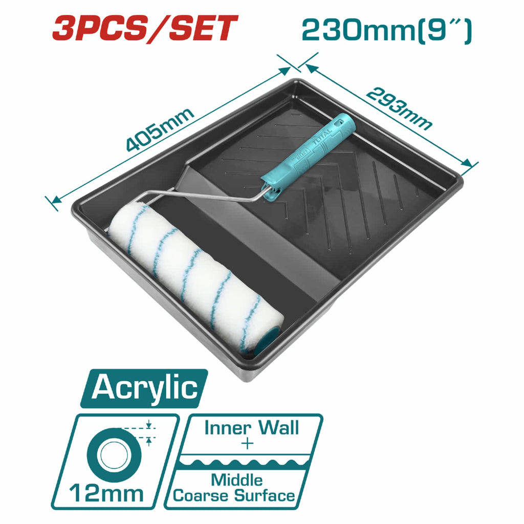 | Características | Bandeja para pintar 405x293mm. Pintura acrílica. Pared interna. Set 3 en 1. |