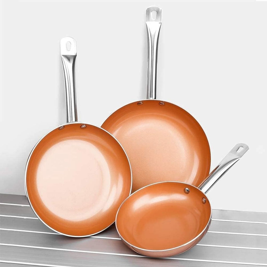 - Set de 3 sartenes de cobre con recubrimiento cerámico antiadherente de 20 cm, 24 cm y 28 cm