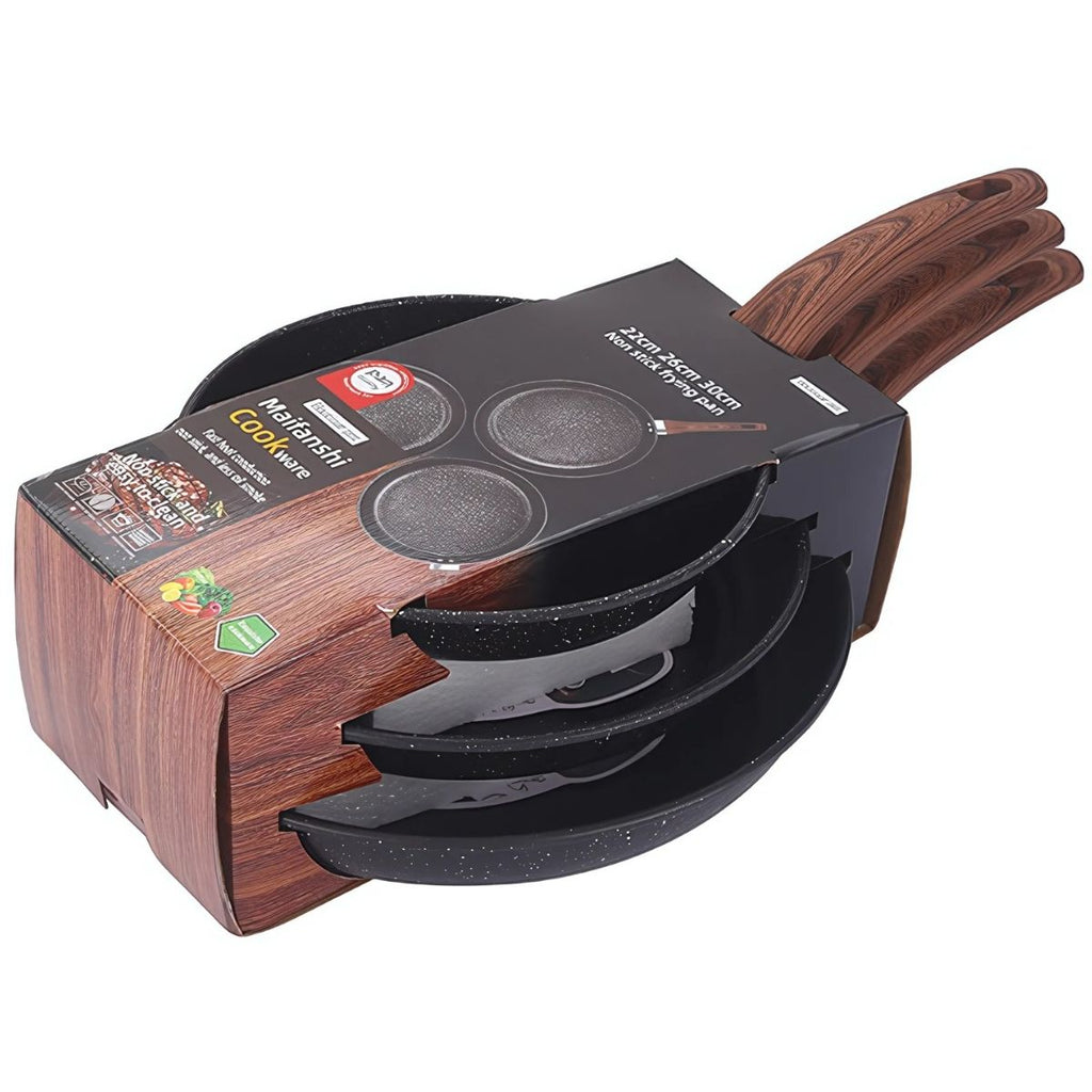 Sartenes Antiadherentes De Piedra de Maifán (Set de 3 unds) Tamaños 8.7'''' 10.2'''' Y 11.8'''' (22,26,30cm) Con Mango Efecto Madera.