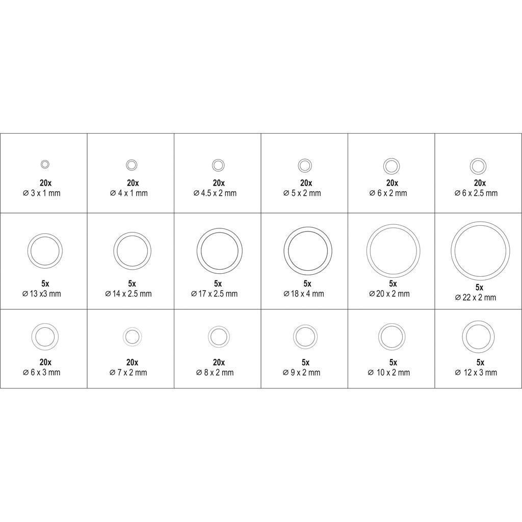 PARA ALTA CARGA TÉRMICA Y QUÍMICA; PARA SISTEMAS DE AIRE ACONDICIONADO DE TURISMOS; SELLO DE JUNTA TÓRICA DE GOMA HNBR; INCLUYENDO: 20PCS 3MM I.D. DIÁMETRO 1MM; 20PCS 4MM I.D. DIÁMETRO 1MM; 20PCS 4.5MM I.D. DIÁMETRO 2MM; 20PCS 5MM I.D. DIÁMETRO 2MM; 20PCS 6MM I.D. DIAMET