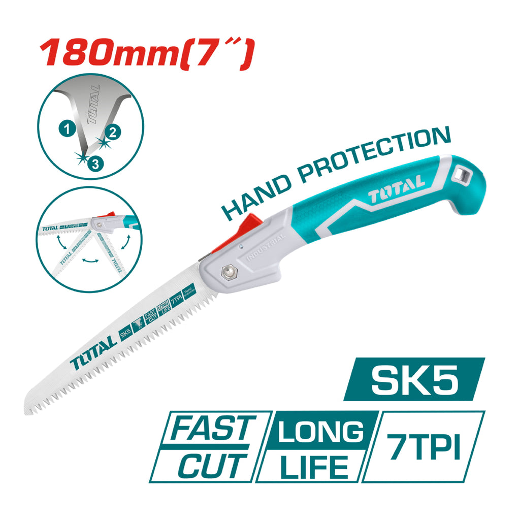 Serrucho pleglable 7''/180mm Material Taiwan SK5 7TPI Triple diente endureciodo Con proteccion de corte.