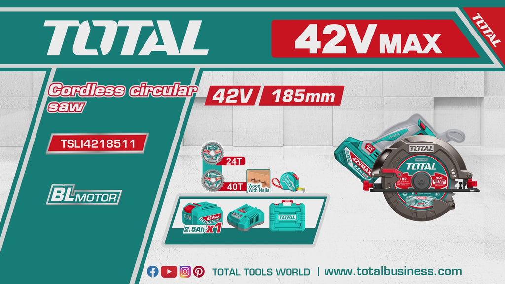 Sierra Circular 42V Disco 7-1/4'' (185mm) Motor sin Escobillas. 4800rpm Corte 45°-45 mm y 90°- 65 mm. Incluye Batería, cargador y accesorios.