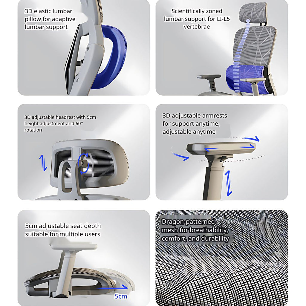 - Asiento de Malla Transpirable con Diseño Moderno: Favorece la circulación del aire y aporta un toque distintivo gracias a su patrón tipo dragón.