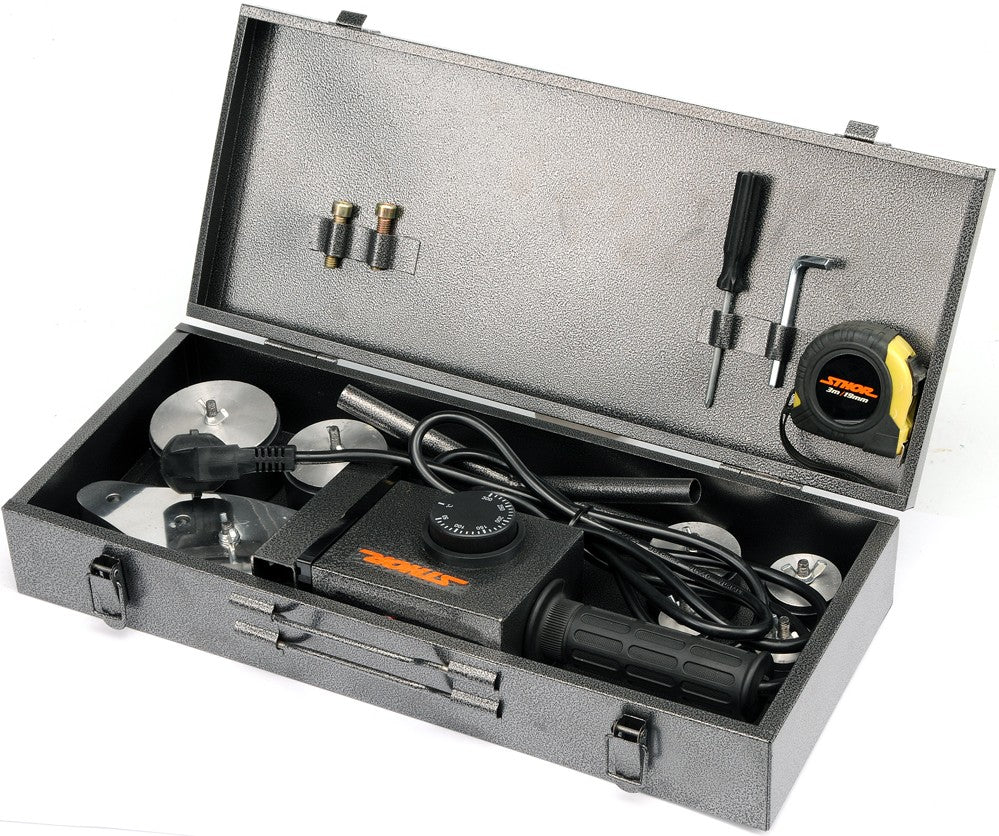 Soldadora para tubos termoplásticos de STHOR. El dispositivo está diseñado para conexiones de tuberías y sujetadores hechos de materiales termoplásticos. Permite un trabajo rápido y cómodo en la ejecución de instalaciones de agua.