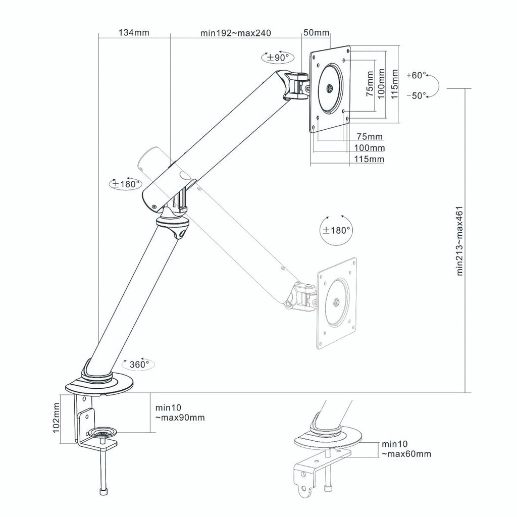 - Brazo articulado con rotación completa de 360°, giro lateral de ±180° e inclinación vertical de +60° a -50°.