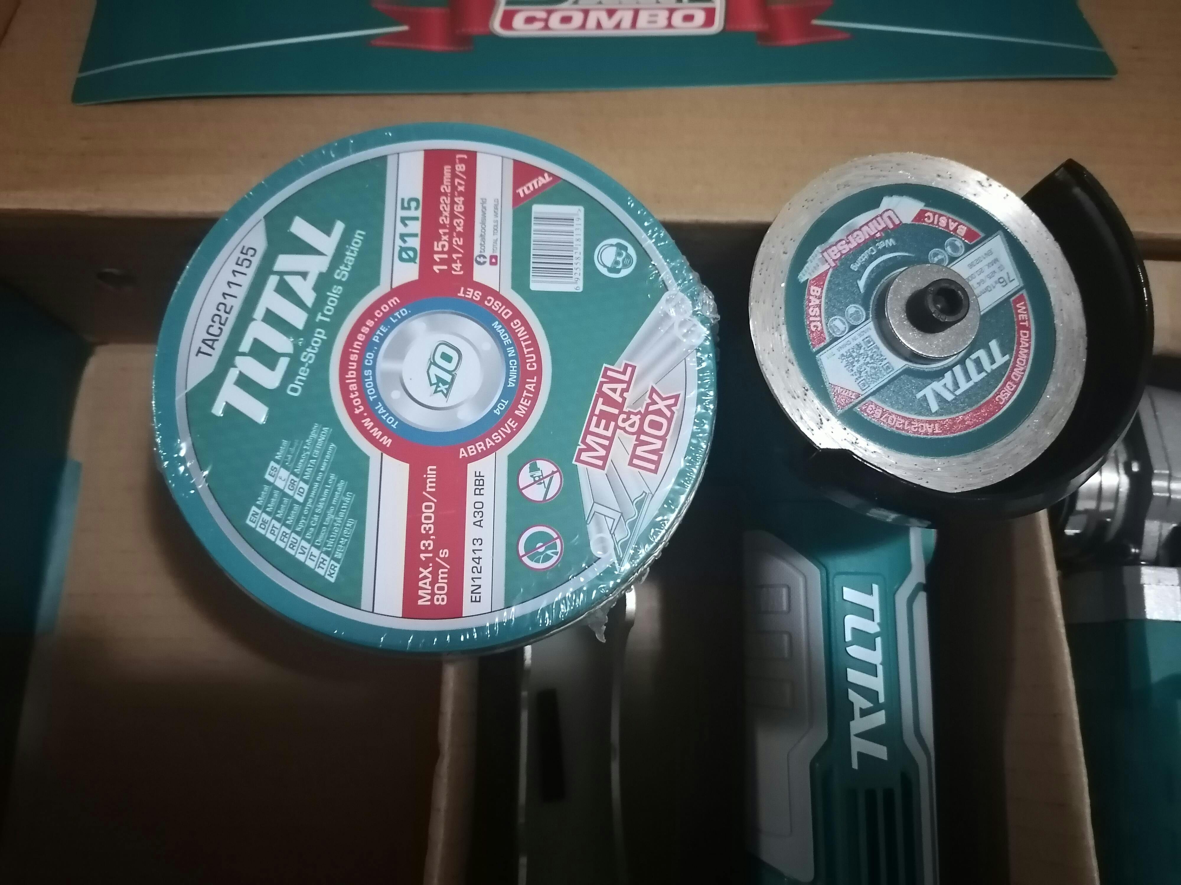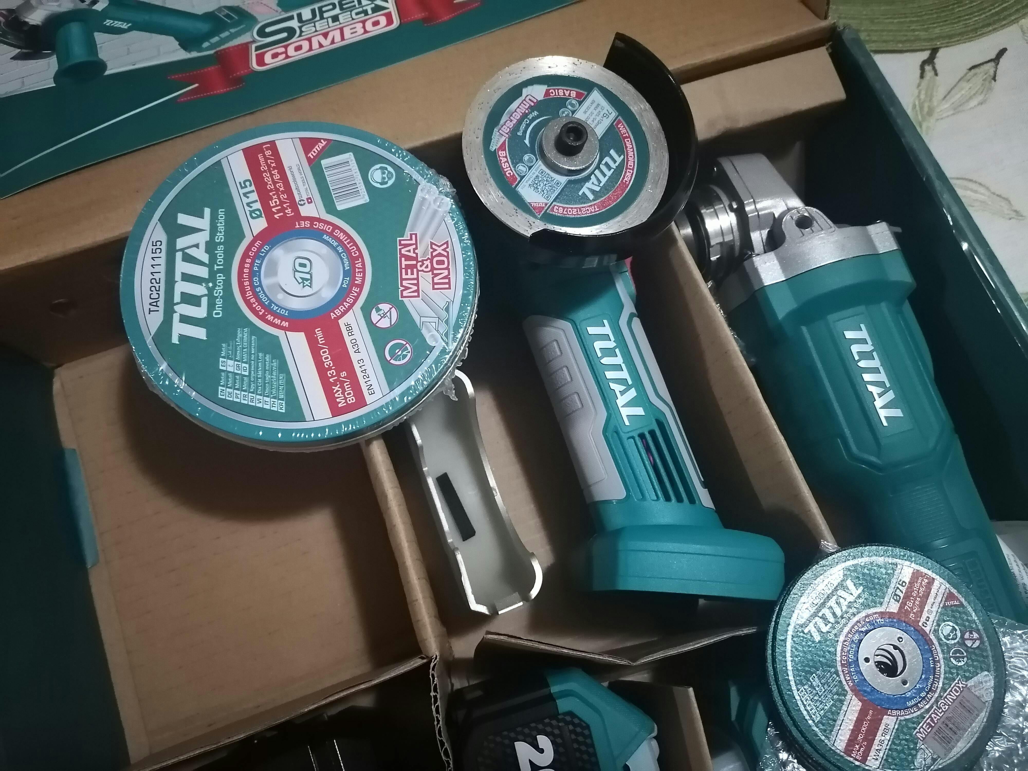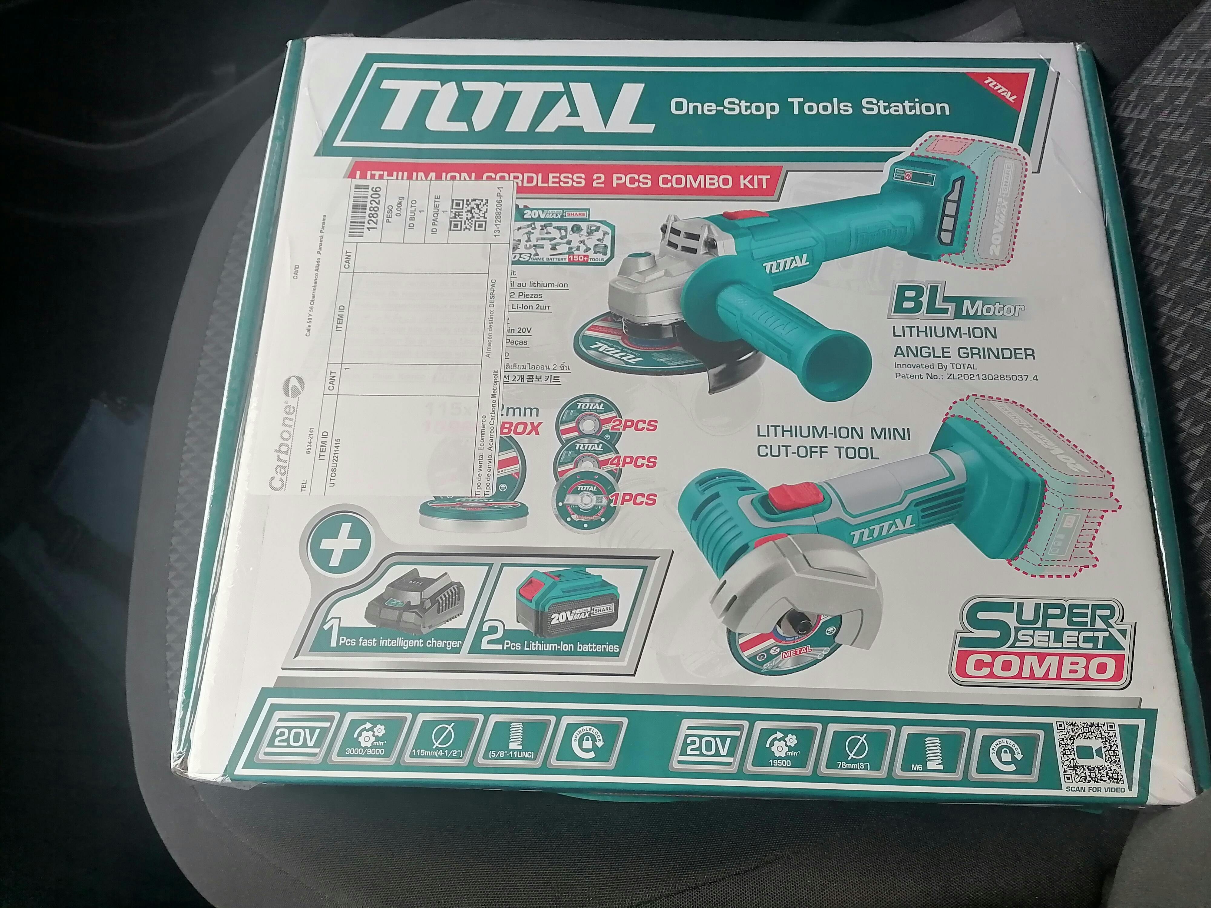 | Características | Super combo Total incluye una esmeriladora angular y mini sierra circular compacta |