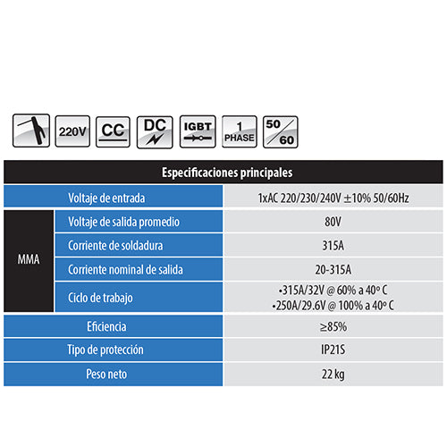 | Corriente de soldadura | 315A |