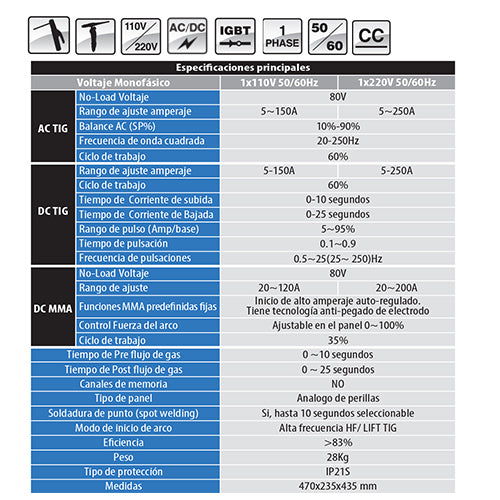 la potencia que se requiere en la industria pesada, arrojando 250 amperios de potencia de soldadura TIG y 200 Amp de MMA en monofásico 220V, con un ciclo de trabajo de clase industrial del 60% en TIG y 35% en MMA. La unidad está