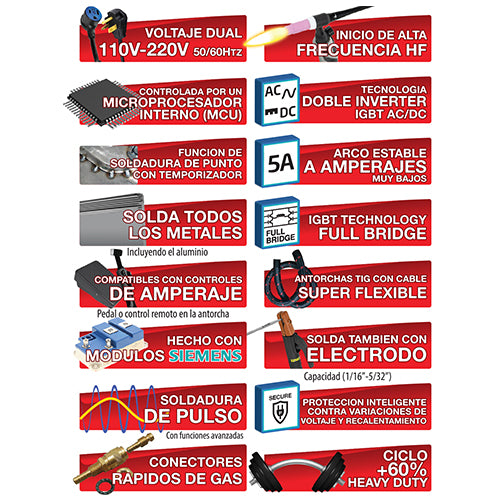 equipada con elementos como el pulso completamente ajustable, frecuencia de AC, control de balance de AC, también con función de soldadura de punto (Función Spot) la cual le permitirá controlar el tiempo de la soldadura de punto para