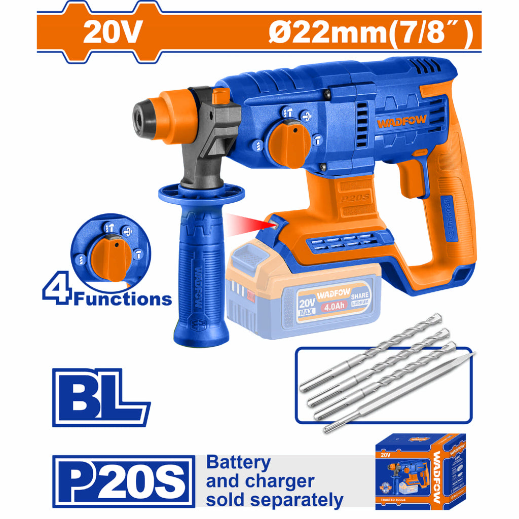 | Características | Voltaje: 20V. Velocidad sin carga: 0-1100 rpm. Tasa de impacto: 0-5400 bpm. Energía de impacto: 2.0J. Capacidad máxima de perforación: Concreto: 22 mm. Acero: 13 mm. Madera: 28 mm. |