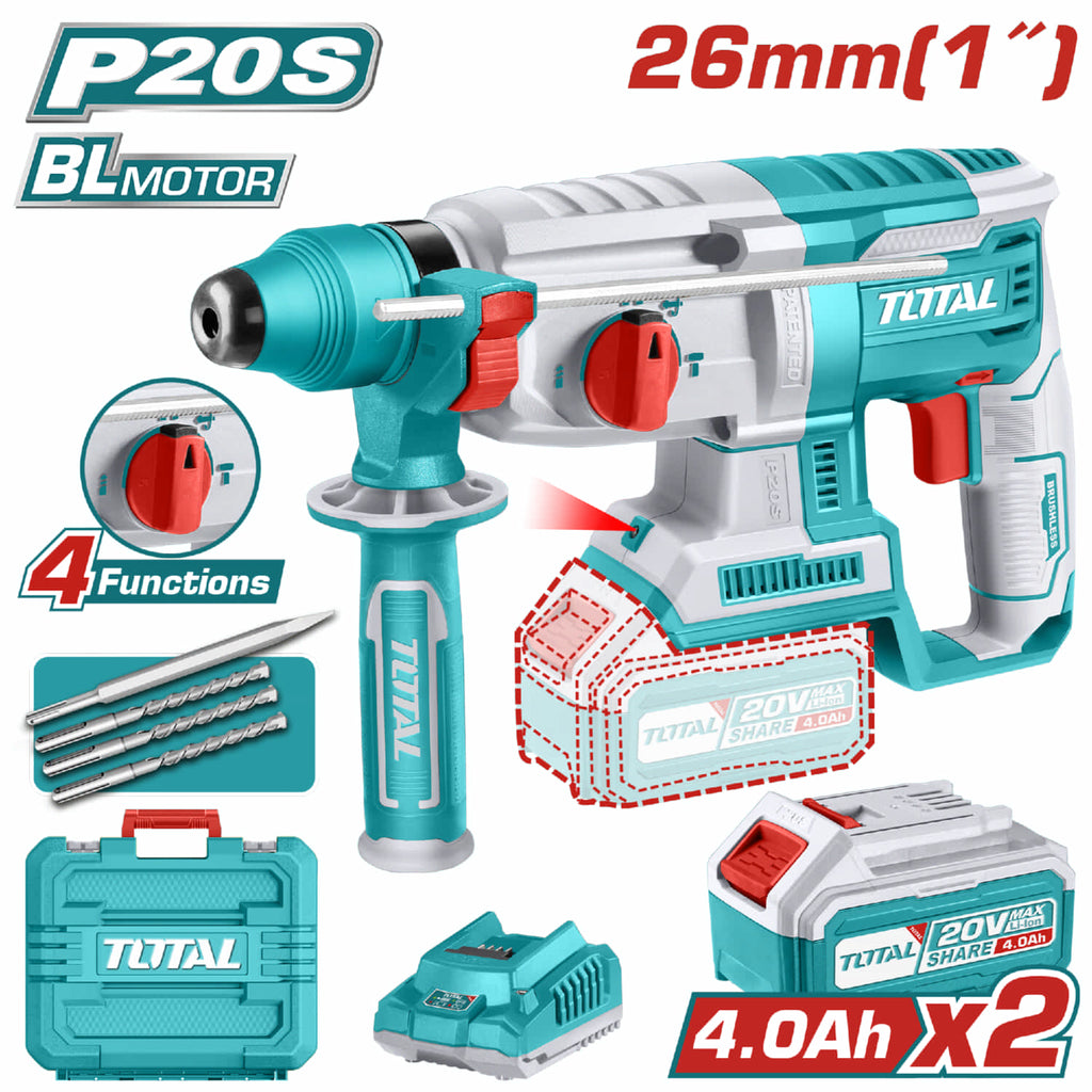 Taladro Rotomartillo 20V. Motor sin escobillas. Perfora concreto: 26mm. Incluye batería y cargador.