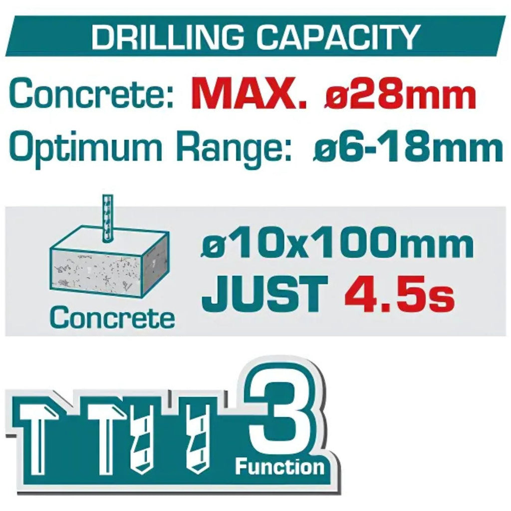 Taladro Rotomartillo 42V 900 rpm. 4400 bpm. Perfora 28mm en concreto. Incluye batería y cargador y accesorios.