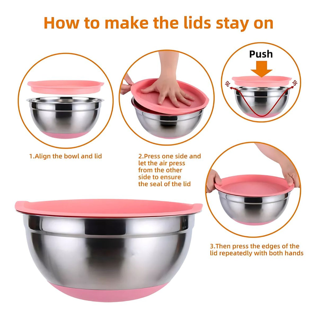 Tazones Multifuncionales De Acero Inoxidable Con Tapa. Color Crema. (Set de 6 piezas) Bowl de cocina.