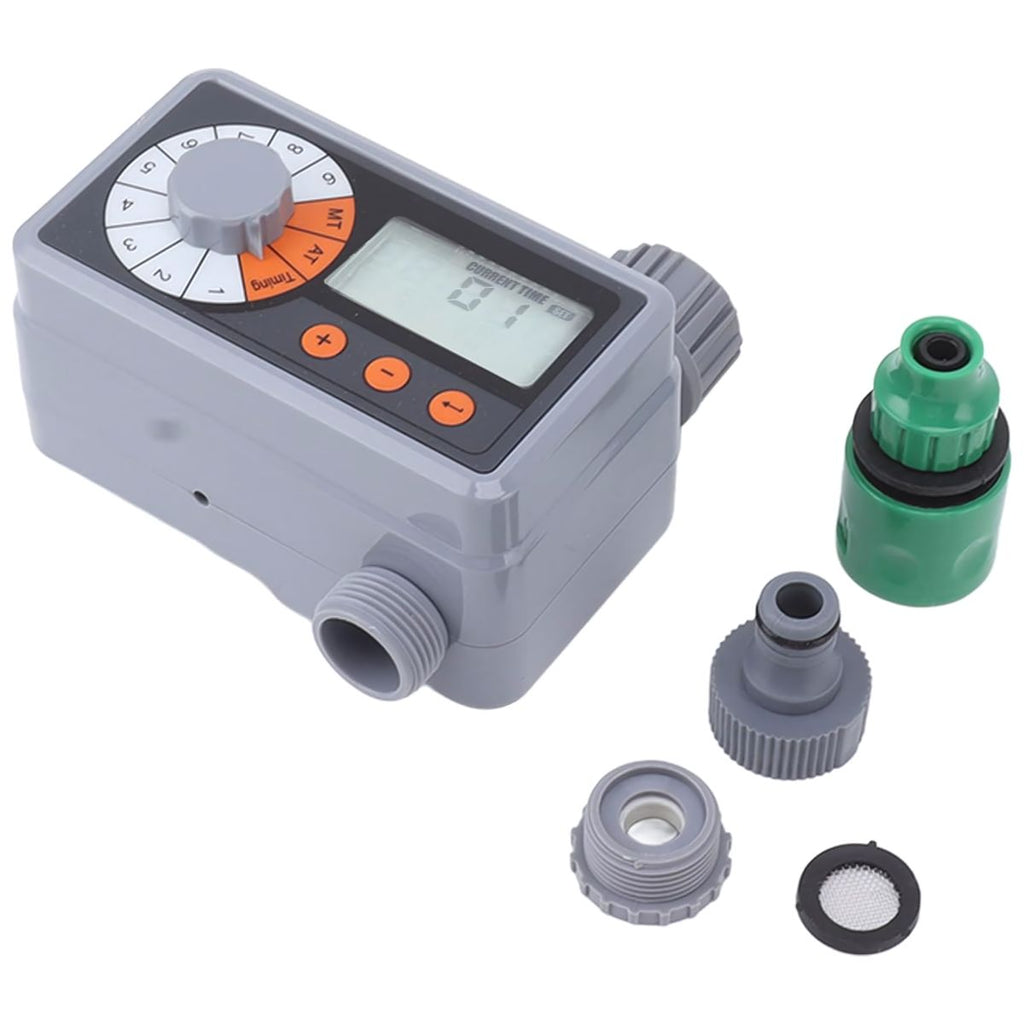 - Temporizador digital con pantalla LCD: permite ajustar fácilmente los intervalos, duración y frecuencia del riego según tus necesidades.