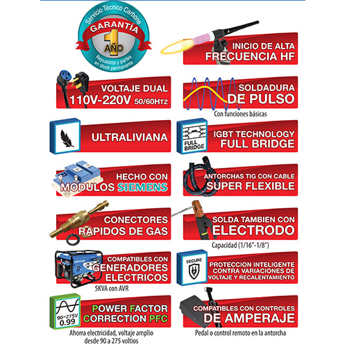 | Características 3 | Hecho con módulos SIEMENS, Tecnología IGBT Inverter Full Bridge HF-TIG (GTAW)/ DC MMA (SMAW). Protección inteligente contra variaciones de voltaje y recalentamiento. |