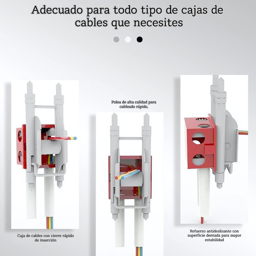 - Polea de paso rápido – El rodillo central facilita el paso de cables sin dañarlos ni enredarlos, optimizando tiempos de trabajo.