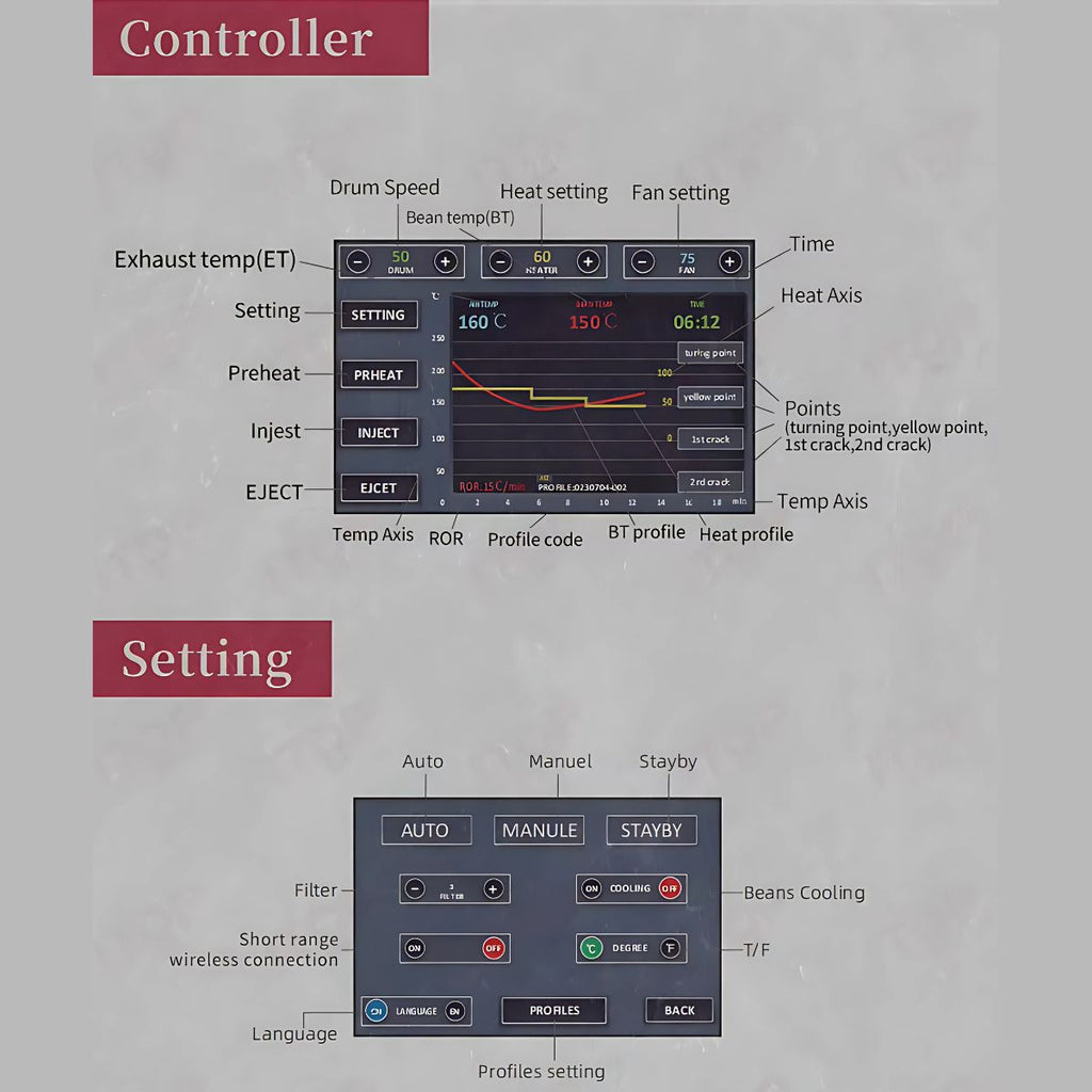 - Pantalla táctil de 7” con modos de control Automático, Manual y Artisan para un tueste personalizado.