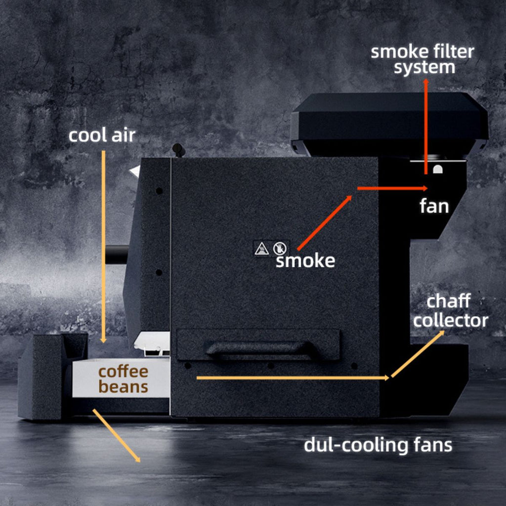 - Capacidad ideal: Tuesta hasta 500 gramos de granos por ciclo, perfecto para cafeterías, negocios pequeños o entusiastas del café.